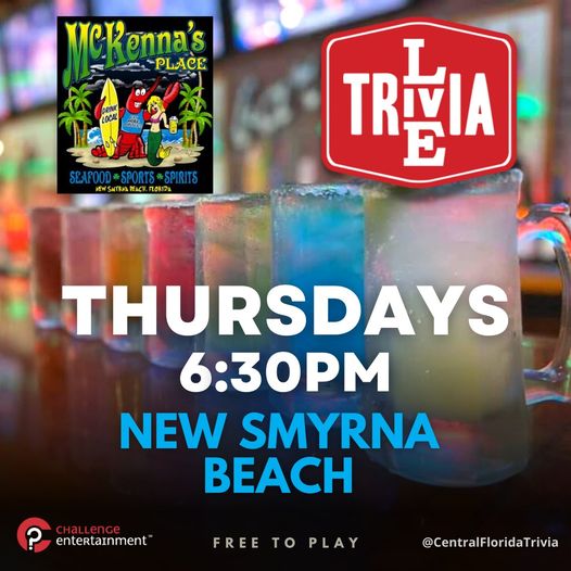 Join us Every Thursday from 6:30-8:30pm with DJ BIG TOM & Challenge Entertainment for Live Trivia! Call up all your friends and family because you might need some help! We are giving away McKenna's Place NSB Gift Certificates* for our top 3 teams. Ask about our food and drink specials and make sure to check Challenge Entertainment Florida Trivia Facebook Page on the day of the event for free clues to answers for the game!